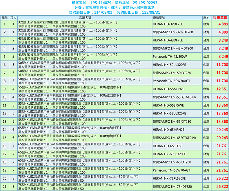 臺銀共契★電視機等設備跟進項次 案號 : LP5-114029